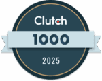 A round badge with the text "Clutch 1000 2025" displayed on a blue background with a light blue ribbon across it.