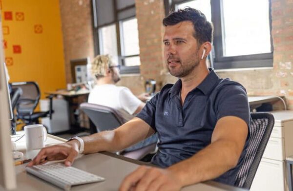 A man wearing wireless earbuds works at a computer in an office, with another person seated and working in the background.